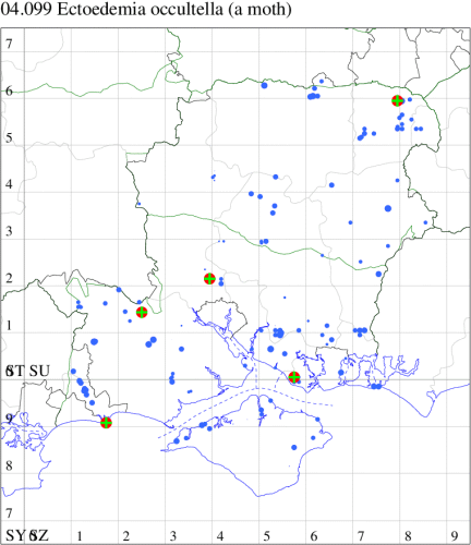 Common in England and Wales, mainly in the south and west, and in Scotland, in the north and east; in Ireland, it has been recorded from Co. Galway and the south-western counties. Probably under-recorded in Hampshire and on the Isle of Wight, where the extent of known records correlate with those areas in which the recording effort is concentrated. Wingspan male 5.1-6.1 mm, female 5.1-6.6 mm. Imago is very similar to E. occultella, but differs in its smaller size, broader and more silvery fascia, seldom extended inwards along the margins, and more silvery cilia (MBGBI Vol 1). Adults difficult to distinguish from other Ectoedemia species, and more frequently recorded in the larval stage, when mines are relatively easy to find where they are present. Larva mines leaves of Silver Birch, Downy Birch and Hazel, over-wintering as a pupa.