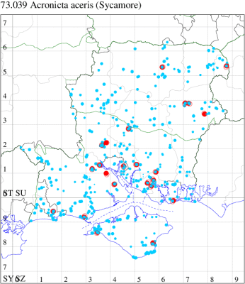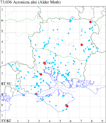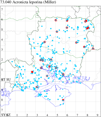 Common on grassland, heathland, marshes, gardens and a wide range of other habitats throughout much of the British Isles. In Hampshire and on the Isle of Wight widespread and common in all three vice-counties. Wingspan 35-43 mm. Superficially similar to other Acronicta species, it can usually be distinguished by the curved white mark near the rear edge of the forewing, which is normally present even in melanic specimens. Larva feeds on various herbaceous and woody plants, including Broad-leaved Dock, Common Sorrel, Ribwort Plantain, Greater Plantain, Water Mint, Bramble, Hop, Hawthorn and Burnet Rose, over-wintering as a pupa.