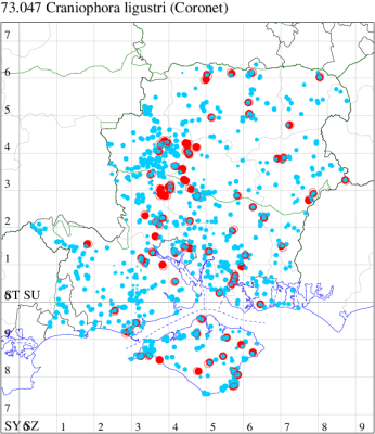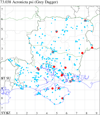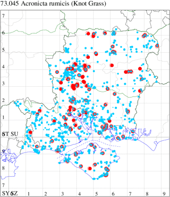 For the maps, all records prior to 2020 are shown by a blue dot (the larger the dot, the more recent), with the current year's records shown in red. As previous records are superimposed on any report for 2020, new sites have greater emphasis (i.e. will show as 'more red').