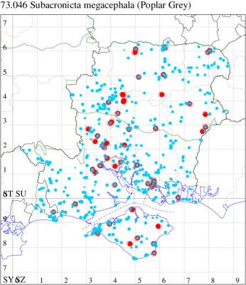 Local in parks, gardens, woodland and scrub throughout southern England. In Hampshire and on the Isle of Wight widespread and fairly common, particularly in suburban area. Wingspan 41-49 mm. The main confusion species are Poplar Grey A. megacephala and Sweet Gale Moth A. euphorbiae, but has characteristic S-shaped subterminal band of pale grey blocks. Larva feeds on Horse-chestnut, Sycamore and Field Maple, over-wintering as a pupa.