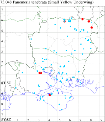 VC11: Marchwood, one, 24 Jun (CTh); Woodlands, New Forest, present, 19 May (RBW); Totton, one, 22 May; two, 11 Jul (LH); Romsey, one, 24 Jun (SLay); one, 11 Jul (NRJ); Dibden Purlieu, one, to actinic, 13 Aug; one, to actinic, 25 Jun (RAC); Bitterne, one, to actinic, 21 May (PAB); Eastleigh, one, to actinic, 26 Jun; one, to actinic, 27 Jun (KArb); Winchester, one, 04 Jul (THW); Catisfield, one, to actinic, 25 Jun (ALR); Fareham, one, 16 Jul (ADT); one, 01 Jul; two, 15 Jul (KJW); Botley, one, to actinic, 23 Jun; one, to actinic, 25 Jun; one, to actinic, 05 Jul; one, to actinic, 25 Jun; one, to actinic, 04 Jul (SLB); Wickham Common, one, 12 Aug (KC); Burton, nr Christchurch, one, 10 Jul (JSw); Milford on Sea, one, 25 Jun (MMcM); Southsea, larva, one, field observation, 02 Aug (HJo);