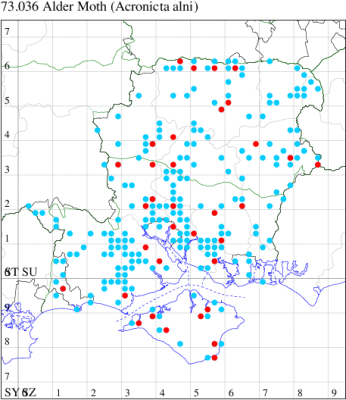 Common on grassland, heathland, marshes, gardens and a wide range of other habitats throughout much of the British Isles. In Hampshire and on the Isle of Wight widespread and common in all three vice-counties. Wingspan 35-43 mm. Superficially similar to other Acronicta species, it can usually be distinguished by the curved white mark near the rear edge of the forewing, which is normally present even in melanic specimens. Larva feeds on various herbaceous and woody plants, including Broad-leaved Dock, Common Sorrel, Ribwort Plantain, Greater Plantain, Water Mint, Bramble, Hop, Hawthorn and Burnet Rose, over-wintering as a pupa.