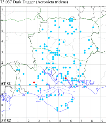 Common in woodland, hedgerows, gardens, scrubby heathland, calcareous grassland, fens and a wide range of other habitats; low altitudes in the north throughout much of the British Isles, a species of conservation concern under the UK Biodiversity Action Plan. In Hampshire and on the Isle of Wight very much more common than Dark Dagger, but undoubtedly under-recorded. Wingspan 33-44 mm. Very similar to Dark Dagger A. tridens, from which separated only by dissection of the genitalia. The larvae of the two species are readily identifiable. Larva feeds on various broad-leaved trees and shrubs, including Blackthorn, Hawthorn, Apple, Birch, Common Lime, English Elm and Rowan, over-wintering as a pupa.