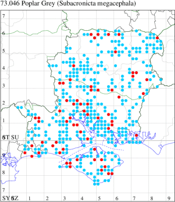 Local in a wide variety of habitats, including hedgerows, woodland, calcareous grassland, fens and hillsides throughout the British Isles. In Hampshire widespread and locally frequent in the south, less common in the north and on the Isle of Wight. Wingspan 35-42 mm. Only likely to be confused with dark forms of Poplar Grey Acronicta megacephala, but smaller, with more rounded apex. Larva feeds predominantly on Ash, but also on Alder and Hazel, over-wintering as a pupa.