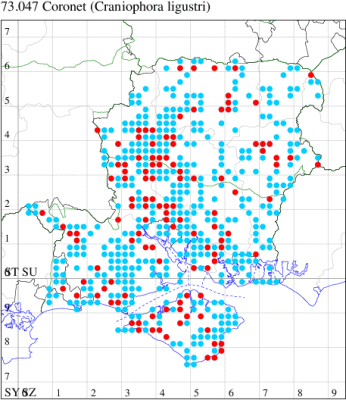 For the maps, all records prior to 2021 are shown by a blue dot (the larger the dot, the more recent), with the current year's records shown in red. As previous records are superimposed on any report for 2021, new sites have greater emphasis (i.e. will show as 'more red').