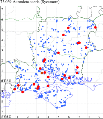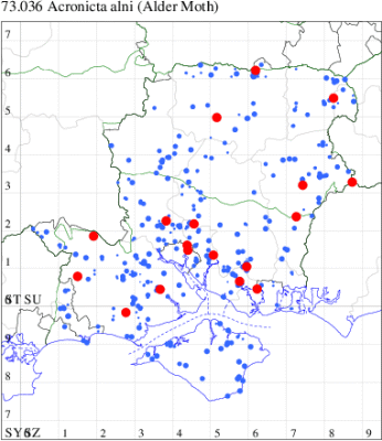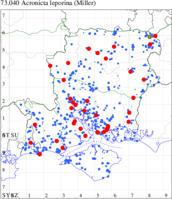 Common on grassland, heathland, marshes, gardens and a wide range of other habitats throughout much of the British Isles. In Hampshire and on the Isle of Wight widespread and common in all three vice-counties. Wingspan 35-43 mm. Superficially similar to other Acronicta species, it can usually be distinguished by the curved white mark near the rear edge of the forewing, which is normally present even in melanic specimens. Larva feeds on various herbaceous and woody plants, including Broad-leaved Dock, Common Sorrel, Ribwort Plantain, Greater Plantain, Water Mint, Bramble, Hop, Hawthorn and Burnet Rose, over-wintering as a pupa.
