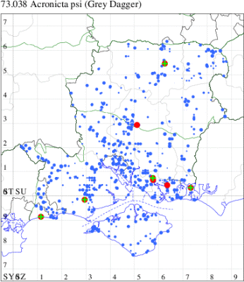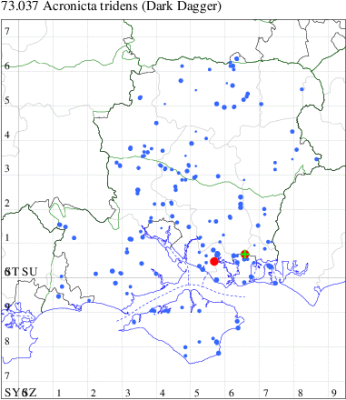 Common in woodland, hedgerows, gardens, scrubby heathland, calcareous grassland, fens and a wide range of other habitats; low altitudes in the north throughout much of the British Isles, a species of conservation concern under the UK Biodiversity Action Plan. In Hampshire and on the Isle of Wight very much more common than Dark Dagger, but undoubtedly under-recorded. Wingspan 33-44 mm. Very similar to Dark Dagger A. tridens, from which separated only by dissection of the genitalia. The larvae of the two species are readily identifiable. Larva feeds on various broad-leaved trees and shrubs, including Blackthorn, Hawthorn, Apple, Birch, Common Lime, English Elm and Rowan, over-wintering as a pupa.