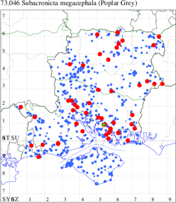 Local in a wide variety of habitats, including hedgerows, woodland, calcareous grassland, fens and hillsides throughout the British Isles. In Hampshire widespread and locally frequent in the south, less common in the north and on the Isle of Wight. Wingspan 35-42 mm. Only likely to be confused with dark forms of Poplar Grey Acronicta megacephala, but smaller, with more rounded apex. Larva feeds predominantly on Ash, but also on Alder and Hazel, over-wintering as a pupa.