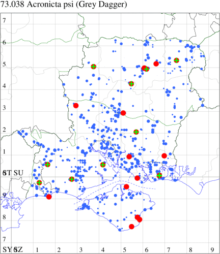 Common in woodland, fens, gardens and a wide range of other habitats throughout much of England and Wales. In Hampshire and on the Isle of Wight very much less common than Grey Dagger, although undoubtedly under-recorded owing to similarity to that species. Wingspan 33-44 mm. Very similar to Grey Dagger A. psi, from which separated only by dissection of the genitalia. The larvae of the two species are readily identifiable. Larva feeds on various broad-leaved trees and shrubs, including Wild Rose, Cultivated Rose, Hawthorn, Blackthorn and Goat Willow, over-wintering as a pupa.