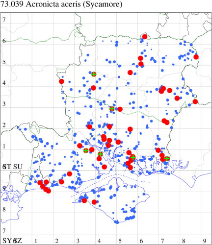 Local in a wide variety of habitats, including hedgerows, woodland, calcareous grassland, fens and hillsides throughout the British Isles. In Hampshire widespread and locally frequent in the south, less common in the north and on the Isle of Wight. Wingspan 35-42 mm. Only likely to be confused with dark forms of Poplar Grey Acronicta megacephala, but smaller, with more rounded apex. Larva feeds predominantly on Ash, but also on Alder and Hazel, over-wintering as a pupa.