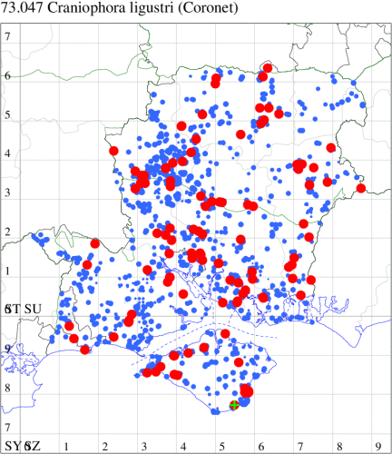 VC11: St Catherine's Hill, Winchester, larva, present, field obs., 18 Sep (IPow); Fareham, larva, one, field obs., 29 Jun; larva, one, field obs., 11 Aug (ADT);