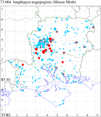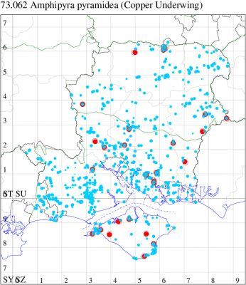 VC11: Godshill, NF, one, to actinic, checked underwing, 14 Aug (MCu); Romsey, one, 18 Aug (MB); Southampton, one, to actinic, 26 Aug (MGP); Stubbington, one, to actinic, 11 Aug (WMay); Fareham, one, 14 Aug; three, 16 Aug (ADT); one, 11 Aug (KJW); Wickham Common, one, 18 Aug (KC); Lovedean, one, how verified?, 07 Oct (ARJ); West Meon, one, 31 Jul; Hen Wood, one, 24 Jul (F.M.G. det. RJD); Horndean, two, to actinic, 11 Sep (PHog); Pennington, one, 10 Aug; one, 08 Sep (RFC);