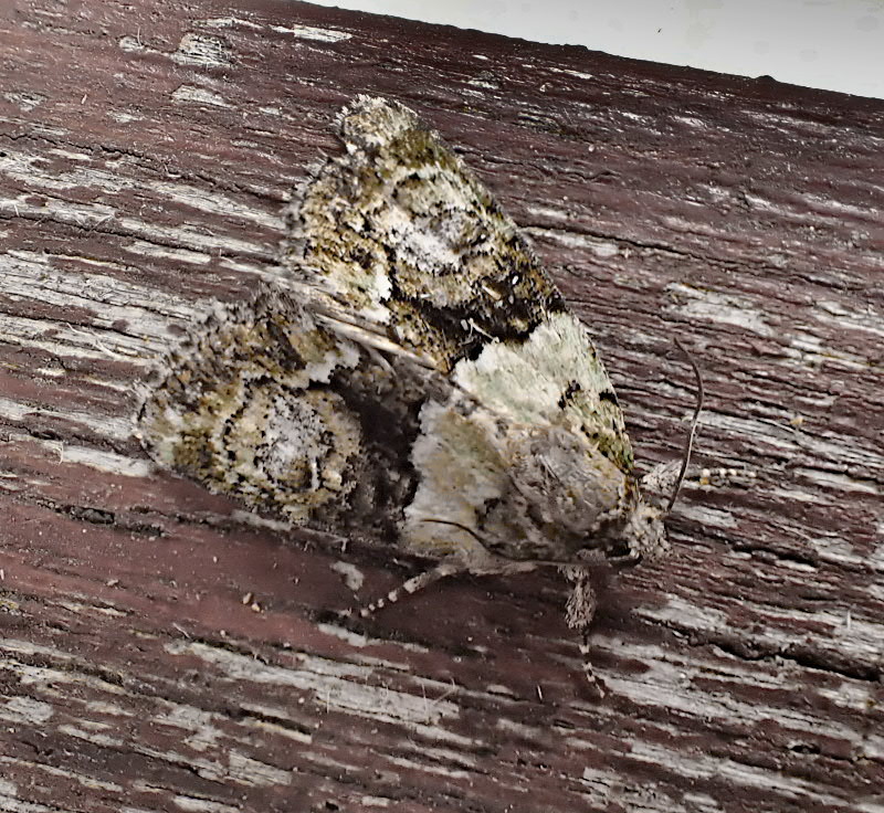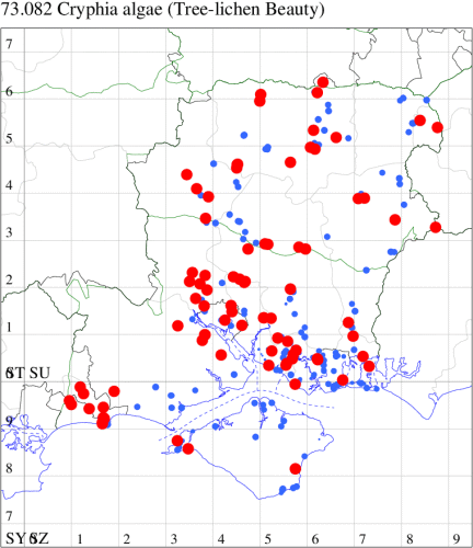 Common in orchards and woodland, and around old buildings, dry-stone walls and sea cliffs throughout the British Isles. Historically widespread and common in Hampshire and on the Isle of Wight, the 21st century has seen a significant decline in reporting rates: based on records received 2000-2023 this decline is in the region of 80-90%. The reason for this is unclear but may be at least in part due to competition with Tree Lichen Beauty which has increased dramatically in the same timeframe.Wingspan 23-31 mm. Dentate antemedian fascia extends from costa to dorsum, in contrast to superficially similar Marbled Green C. muralis, in which antemedian fascia falls short of dorsum. Larva feeds on various lichens, often on walls and tree trunks.