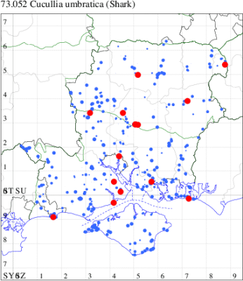 Common in rough ground, chalk and limestone grassland, sand-dunes, shingle beaches and gardens throughout the British Isles. In Hampshire and on the Isle of Wight this species is still fairly frequent in places, especially near the coast. Wingspan 48-57 mm. The only confusion species is Chamomile Shark C. chamomillae, but C. umbratica has forewing fringes clear and unmarked, while on C. chamomillae they are cut by dark veins. Larva feeds on flowers and leaves of Beaked, Marsh, Rough and Smooth Hawk's-beard, Mouse-ear Hawkweed and Perennial Sow-thistle, over-wintering as a pupa.