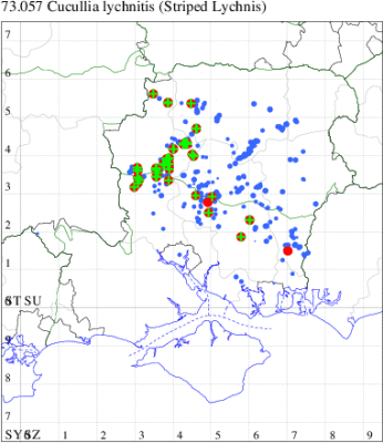 Nationally scarce (Na) and a priority species under the UK Biodiversity Action Plan, on calcareous grassland and roadside verges. Found throughout much of the chalk outcrop of central Hampshire, extending from the South Downs of West Sussex virtually to the border with Wiltshire. It is also breeding in Oxfordshire, Berkshire and in small scattered sites over a wide area in south Buckinghamshire. Hampshire is an important national stronghold for the species, and in 2000 the moth was discovered to have colonised the recently re-seeded extension of the Magdalen Hill Down Reserve near Winchester. Not recorded from the Isle of Wight to date. Wingspan 42-46 mm. The most likely confusion species are Mullein S. verbasci, which is usually larger and brown-tinged, with a clearly defined discal spot on the underside of the hindwing, whereas Striped Lychnis is grey-tinged and does not hindwing underside dot, and Water Betony S. scrophulariae, from which reliably separable only by reference to the genitalia. Larva feeds on flowers of Dark Mullein, over-wintering as a pupa.
