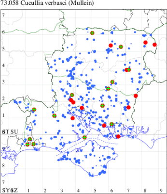 Common in calcareous grassland, woodland clearings, woodland rides, scrub, roadside verges, shingle beaches, parks and gardens throughout much of England and Wales, mostly in the south. In Hampshire and on the Isle of Wight well-distributed, partly as a result of the differing ecology of the two main food-plants. Wingspan 44-56 mm. The main confusion species are Striped Lychnis S. lychnitis and Water Betony S. scrophulariae. The larva is found on various species of mullein (Verbascum), in particular Great Mullein, but it also uses Buddleia in gardens, and not infrequently on figwort (Scrophularia sp.)