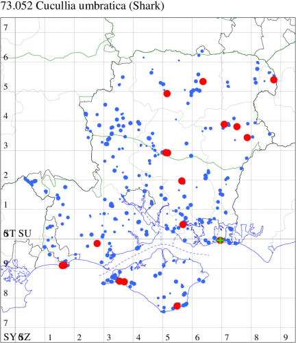 Local on calcareous grassland, waste ground, farmland and gardens; well distributed, showing a preference for sandy or light calcareous soils, and probably most common near the coasts, in England and Wales, Scotland to Perthshire, and Ireland (MBGBI Vol 10). In Hampshire and on the Isle of Wight thinly scattered through the three vice-counties, but scarcer than formerly, probably on account of changed agricultural techniques. Wingspan 42-52 mm. The most likely confusion species is Shark Cucullia umbratica, which see for differences. Larva feeds on flowers of Scentless Mayweed, Corn Chamomile, Stinking Chamomile and Feverfew, over-wintering as a pupa.
