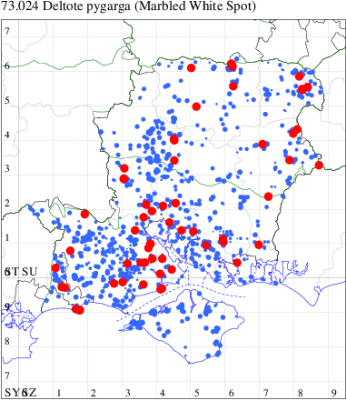 For the maps, all records prior to 2023 are shown by a blue dot (the larger the dot, the more recent), with the current year's records shown in red. As previous records are superimposed on any report for 2023, new sites have greater emphasis (i.e. will show as 'more red').