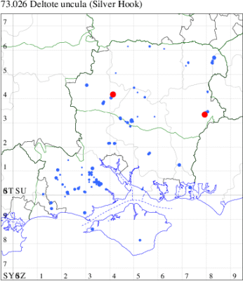 VC11: Earliest: Horsea Island, 19 May, 2 (F.M.G.) Latest: Beaulieu Heath, NF, 29 Jul, 0 (CBel) Max count: Wickham, 23 Jun, 19 (F.M.G.)