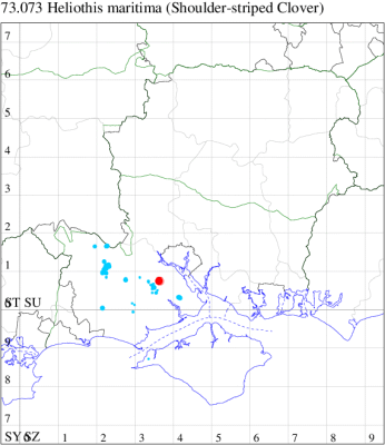 A rare Red Data Book and a priority species under the UK Biodiversity Action Plan, now confined to acid heathland in Hampshire and neighbouring counties. In Hampshire more or less confined to the New Forest, where it occurs on damp heathland, although recent records have been few, with none since 1999. Recorded on the Isle of Wight for the first, and so far only, time at Freshwater in 1985. The south-eastern European subspecies has been recorded as a rare migrant in south-east Kent. Wingspan 32-37 mm. Day-flying, may come to light. The main confusion species is Marbled Clover H. viriplaca, which lacks the distinctive basal streak of H. maritima. Larva feeds on flowers of Cross-leaved Heath, over-wintering as a pupa.