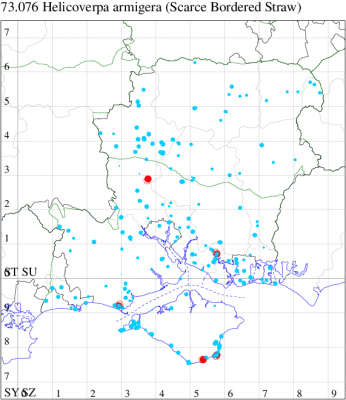 A moderately frequent immigrant from southern Europe, north to Shetland. In Hampshire and on the Isle of Wight recorded in small numbers in most years, although the outstanding migrant year of 2006 saw over 320 individuals recorded. Wingspan 30-40 mm. The main confusion species are Bordered Straw Heliothis peltigera, which has forewing with a distinctive marginal dot above the tornus, and with reniform stigma usually joined to the costa by a dark triangular wedge, and Eastern Bordered Straw Heliothis nubigera, which has forewing more mottled, subterminal band more indented, and pronounced marginal dots (MBGBI Vol 10). Larva polyphagous, most likely to be found in Britain on imported fruit and cut flowers, but in its native range can be of commerical importance damaging crops such as Tomato and Maize.