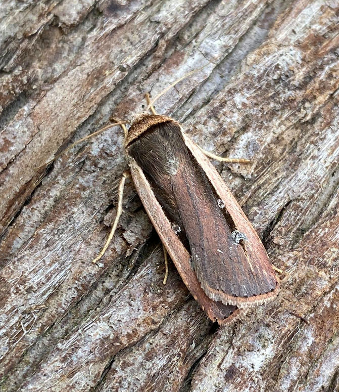 Local on heathland and moorland, and in bogs throughout the British Isles, a species of conservation concern under the UK Biodiversity Action Plan. In Hampshire common on heathland in the New Forest and in the north-east, but uncommon elsewhere and on the Isle of Wight. Wingspan 36-42 mm. Variable, with the grey form neglecta more common in the south of Britain, and red forms in the north of Britain; in north-east Hampshire both grey and red forms occur. The grey form may be confused with Square-spot Rustic X. xanthographa, but X. castanea always characterised by reniform and orbicular stigmata inconspicuous, concolorous with ground colour, outlined ochreous, and reniform stigma with dark dot in dorsal half (MBGBI Vol 9). Larva feeds on Heather, Bell Heather and Cross-leaved Heath.