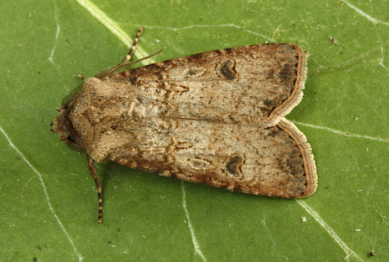 Common in gardens, farmland, parkland, oak woodland and sand-dunes throughout the British Isles. Widespread and common in Hampshire and on the Isle of Wight. Wingspan 32-42 mm. Underwing pearly white with darker veins, suffused grey in dark examples, a feature shared amongst its congeners only by the larger Pearly Underwing Peridroma saucia and Dark Sword-grass A. ipsilon, which see. Larva feeds on roots and lower stems of cabbages and various root crops, causing sufficient damage to be a serious pest in some areas.