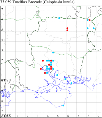 Previously a rare and local resident on shingle beaches and grassy areas in parts of south-eastern England, predominantly coastal; in Kent it occurs at Dungeness and along the coast to Folkestone, including records from Hythe, Dover and Kingsdown. In Sussex, larvae can be common on shingle beaches and waste places within a mile of the sea-shore. Prior to 2000, there were just three records, all coastal: the first at Locks Heath in 1971, with one at Southsea in August 1992 and one in Gosport in August 1996. However, the 21st Century has seen an expansion of range inland, from a base apparently in Greater London and since 2015 it has been recorded annually, both along the coast and from the north-east. The first Isle of Wight record was also in 2015. Wingspan 32-34 mm. Larva feeds on Purple Toadflax and Common Toadflax, over-wintering as a pupa.
