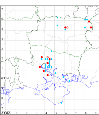 For the maps, all records prior to 2022 are shown by a blue dot (the larger the dot, the more recent), with the current year's records shown in red. As previous records are superimposed on any report for 2022, new sites have greater emphasis (i.e. will show as 'more red').