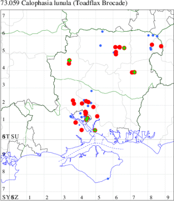 Previously a rare and local resident on shingle beaches and grassy areas in parts of south-eastern England, predominantly coastal; in Kent it occurs at Dungeness and along the coast to Folkestone, including records from Hythe, Dover and Kingsdown. In Sussex, larvae can be common on shingle beaches and waste places within a mile of the sea-shore. Prior to 2000, there were just three records, all coastal: the first at Locks Heath in 1971, with one at Southsea in August 1992 and one in Gosport in August 1996. However, the 21st Century has seen an expansion of range inland, from a base apparently in Greater London and since 2015 it has been recorded annually, both along the coast and from the north-east. The first Isle of Wight record was also in 2015. Wingspan 32-34 mm. Larva feeds on Purple Toadflax and Common Toadflax, over-wintering as a pupa.
