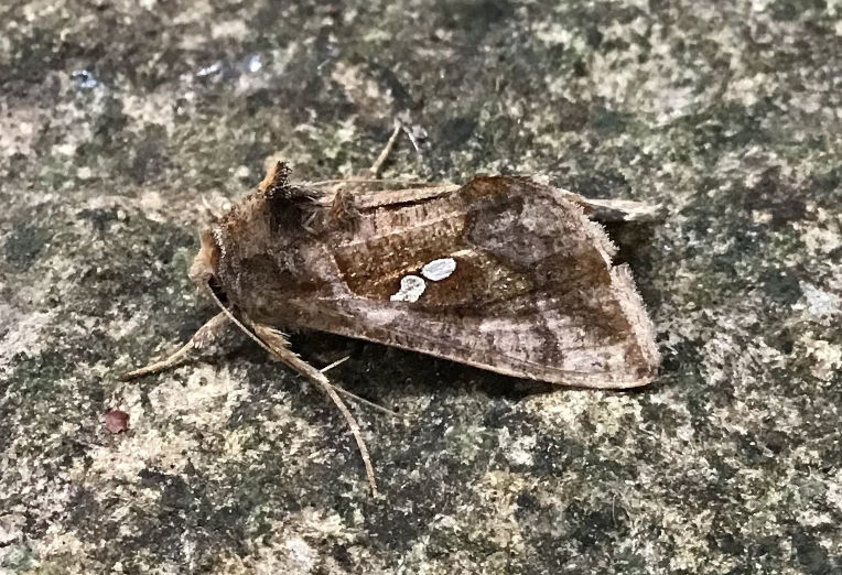 Common in a wide range of habitats, including woodland, downland, hedgerows and gardens throughout the British Isles. In Hampshire and on the Isle of Wight fairly widespread and common. Wingspan 39-45 mm. The main confusion species is Beautiful Golden Y A. pulchrina, in which reniform stigma dark purplish brown, dorsal half at least finely outlined pale golden (MBGBI Vol 10). Larva feeds on a wide variety of plants, including Stinging Nettle, White Dead-nettle, Red Dead-nettle, Hogweed and Honeysuckle.