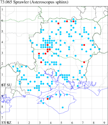 For the maps, all records prior to 2021 are shown by a blue dot (the larger the dot, the more recent), with the current year's records shown in red. As previous records are superimposed on any report for 2021, new sites have greater emphasis (i.e. will show as 'more red').