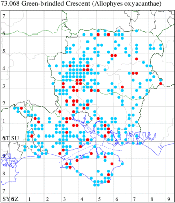 Common in broad-leaved woodland, scrub, hedgerows and gardens throughout the British Isles, a species of conservation concern under the UK Biodiversity Action Plan. In Hampshire and on the Isle of Wight widely distributed, but not particularly common. Wingspan 38-48 mm. Occurs in two forms, and their intermediates, in any shade on a scale from green to brown, but always easy to recognise and unlike any other British moth. Larva feeds on Hawthorn and Blackthorn and, less frequently, other broad-leaved trees and shrubs.