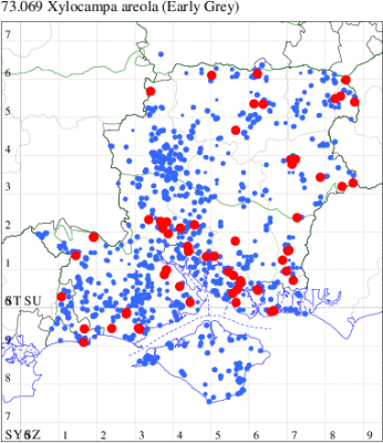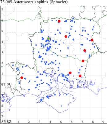 For the maps, all records prior to 2023 are shown by a blue dot (the larger the dot, the more recent), with the current year's records shown in red. As previous records are superimposed on any report for 2023, new sites have greater emphasis (i.e. will show as 'more red').