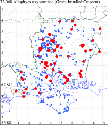 Common in broad-leaved woodland, scrub, hedgerows and gardens throughout the British Isles, a species of conservation concern under the UK Biodiversity Action Plan. In Hampshire and on the Isle of Wight widely distributed, but not particularly common. Wingspan 38-48 mm. Occurs in two forms, and their intermediates, in any shade on a scale from green to brown, but always easy to recognise and unlike any other British moth. Larva feeds on Hawthorn and Blackthorn and, less frequently, other broad-leaved trees and shrubs.