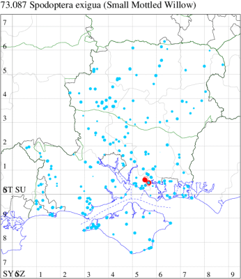 Recorded infrequently through accidental importation in produce from Asia; usually recorded in the larval form and unlikely to reach Britain as a genuine migrant, first recorded at Manchester in 1978 on aquatic plants from Singapore. Not recorded in Hampshire or on the Isle of Wight to date. Wingspan 33-37 mm. Larva feeds on Tobacco, Rice and Cotton, causing sufficient damage to be a serious pest in some areas; no evidence of breeding in the UK.
