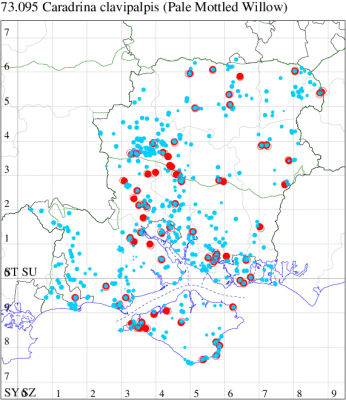 A common migrant from mainland Europe, appearing most frequently in southern coastal counties, less often inland and northwards to southern Scotland and the Inner Hebrides; recorded throughout Hampshire and the Isle of Wight. Wingspan 26-32 mm. The main confusion species are Pale Mottled Willow Paradrina clavipalpis and the rare migrant Dark Mottled Willow S. cilium, but combination of resting position, in which forewings are wrapped tightly around the body, and brownish centres to reniform and orbicular stigmata usually diagnostic. Larva feeds on Dandelion, Groundsel, Broad-leaved Dock, Curled Dock and Common Restharrow.