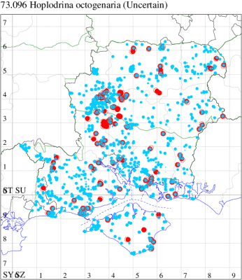 Common in a wide range of habitats, mainly in low-lying areas, including woodland, rough meadows and gardens throughout the British Isles. Widespread and common in Hampshire and on the Isle of Wight. Wingspan 31-33 mm. Easily and frequently confused with Rustic H. blanda, but generally H. octogenaria has broader and rougher forewing, stigmata contrasting with remainder of forewing, and more conspicuous cross-lines (MBGBI Vol 10). The general coloration of The Rustic is brown to grey with a glossy appearance, whereas The Uncertain is ochreous brown and coarser looking, and the orbicular stigma is usually smaller in The Rustic. The hindwings are greyer and glossier in The Rustic and the stigma smaller than The Uncertain. The Uncertain flies from late May, whereas The Rustic usually appears at the end of June. See the comparison photo in the collection above.