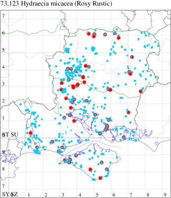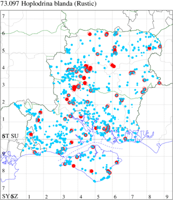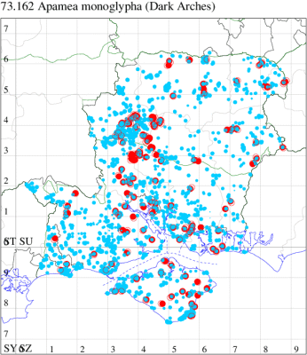 Common in a wide range of habitats, mainly in low-lying areas, including woodland, rough meadows and gardens throughout the British Isles, a species of conservation concern under the UK Biodiversity Action Plan. Common and well distributed in Hampshire and on the Isle of Wight. Wingspan 31-33 mm. Easily and frequently confused with Uncertain H. octogenaria, but generally H. blanda has a straighter costa, less rounded dorsum, smoother, more grey-brown forewing, stigmata less contrasting with remainder of forewing and slightly smaller. The Uncertain has broader wings, and is ochreous brown and coarser looking, with more obvious cross-lines, more contrasting stigmata, and a larger orbicular stigma. The Rustic has greyer and glossier in The Rustic, and appears later than The Uncertain, appearing towards the end of June, with the latter species appearing from late May. See the comparison photo in the collection above.