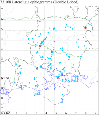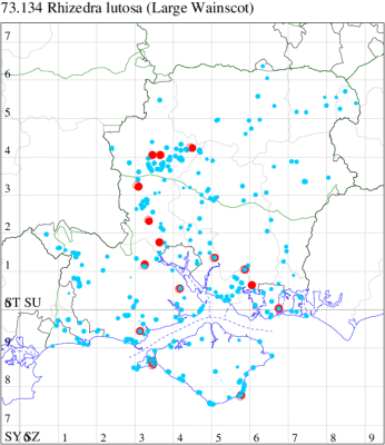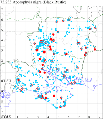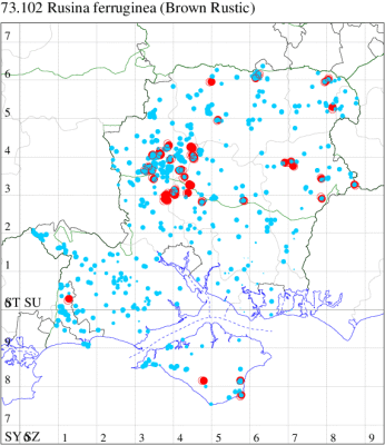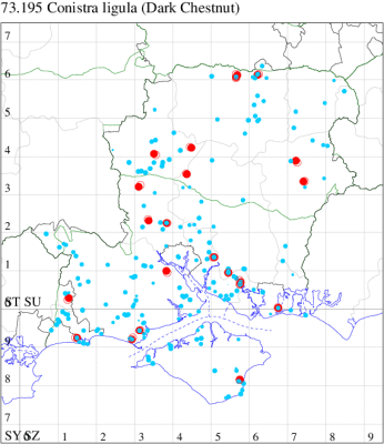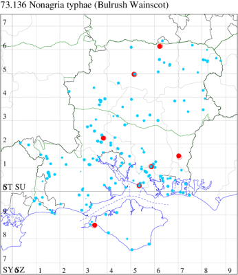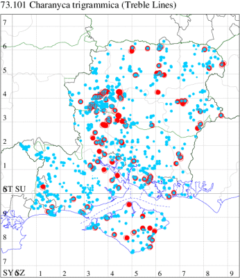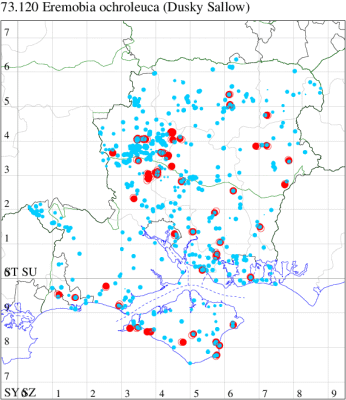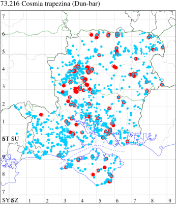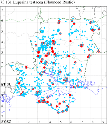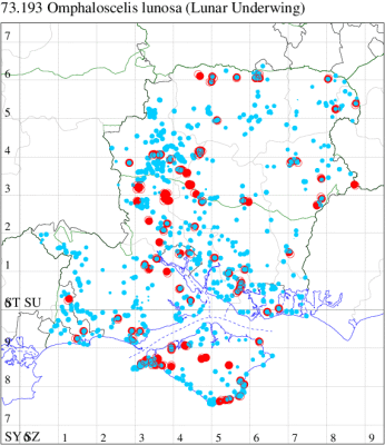 For the maps, all records prior to 2020 are shown by a blue dot (the larger the dot, the more recent), with the current year's records shown in red. As previous records are superimposed on any report for 2020, new sites have greater emphasis (i.e. will show as 'more red').