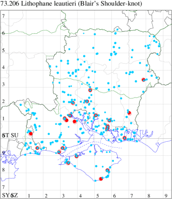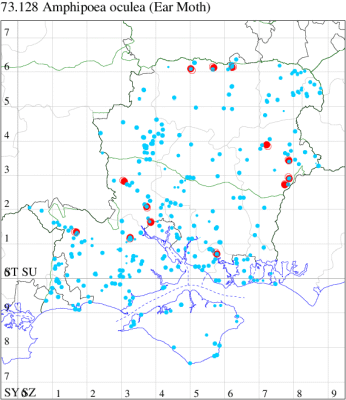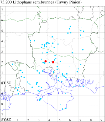 VC12: Burghclere, one, 19 Sep (PBl); Overton, three, 29 Sep (MSi); Axmansford, one, to artificial light, 06 Oct (ACB); Alton, one, to actinic, 17 Sep (DBO); one, to actinic, 18 Sep (CJP); Whitehill, one, 15 Sep; two, 19 Sep; one, 22 Sep; one, 28 Sep; one, 05 Oct; one, 08 Oct (ASto); Lower Froyle, one, 11 Sep (EFig); Farnborough, one, 05 Oct (KBW)