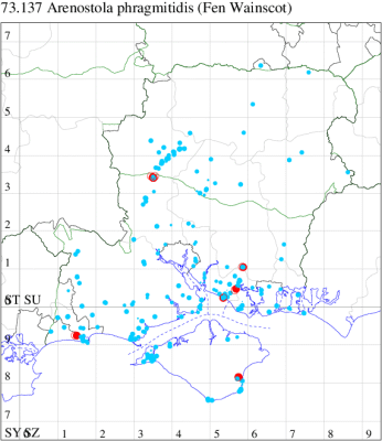 Local in reed-beds, on the south and east coasts of England. In Hampshire and on the Isle of Wight resident in most large reed-beds, and along the river valleys, with occasional wanderers turning up at light some distance from their breeding grounds. Wingspan 29-36 mm. Often found with the superficially similar Chilo phragmitella, which differs, for example, in having very long palps. Larva feeds on invertebrates, both living and dead, inside stems of Common Reed.