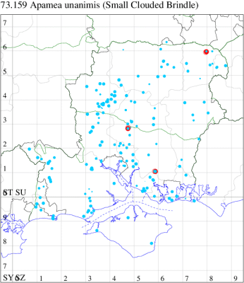 Following an expansion in range and numbers in recent decades, now common in grassland, heathland, woodland rides and gardens throughout southern England and Wales, north to southern Scotland. Widespread and common in Hampshire and on the Isle of Wight. Wingspan 27-34 mm. The main confusion species are Uncertain H. alsines and Rustic H. blanda, but less variable and often slightly smaller than these species, generally rather pale grey-brown, with relatively large orbicular and reniform stigmata, usually slightly darker than the ground colour, and usually distinctly white-edged. Larva feeds on various herbaceous plants, including Dandelion, Greater Plantain, Ribwort Plantain, Primrose and Prickly Lettuce.