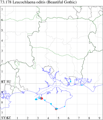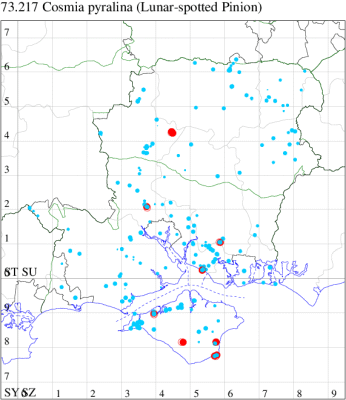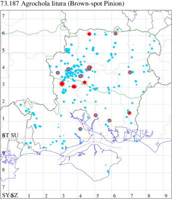 VC10: Headon Warren, one, to actinic, 17 Sep (PBa); West High Down Quarry, six, to light, 08 Sep (IOu); Freshwater, one, 14 Sep (DBW); Freshwater Bay, one, 14 Sep (SDa); four, to actinic, 15 Sep; three, to actinic, 17 Sep; seven, to actinic, 19 Sep; four, to actinic, 21 Sep; Freshwater, one, to actinic, 20 Sep; Compton Down, eight, to actinic, 13 Sep; six, to actinic, 14 Sep; seven, to actinic, 20 Sep; Brook Down, three, to actinic, 19 Sep (PBa)