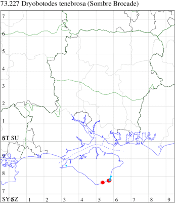 Nationally scarce (Nb) on shingle beaches, sand-dunes and sea cliffs, along the coasts of southern and south-eastern England from Cornwall to Suffolk and, locally, on the southern slopes of the South Downs. On the Isle of Wight, common on the Freshwater cliffs. In Hampshire there have been two records, at Southsea in September 1988, and Hengistbury Head (in the Dorset section of vice-county 11) in October 1996. Wingspan 36-42 mm. The dark form ingenua could be confused with Deep-brown Dart A. lutulenta, which flies at the same time, sometimes on the same ground, but in A. lutulenta the forewing is more ample, with pointed apex; the median fascia is darker than the adjacent areas and the fringe is not chequered (MBGBI Vol 10). Larva feeds on various herbaceous plants, including Sea Campion, Common Sorrel, Bramble and Wood Sage.