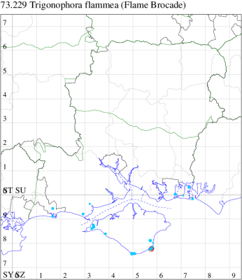 Local on sea cliffs, sand-dunes, shingle beaches and grassy slopes, on the coast of England and Wales. In Hampshire fairly common in the south and on the Isle of Wight, but very uncommon in the north. Wingspan 39-43 mm. Can only be confused with Black-banded P. xanthomista or Large Ranunculus P. flavicincta, which see. Larva feeds on Hound's-tongue, Sea Plantain, Thrift and Biting Stonecrop.