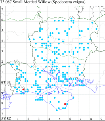 Common in grassland, farmland and gardens throughout the British Isles. Widespread and common in Hampshire and on the Isle of Wight. Wingspan 24-32 mm. Very variable in size, but easy to recognise by the series of four small dots along the costa of each forewing, the first, at about one quarter distance from the base of the wing, often the least obvious; one of a number of superficially similar, fairly nondescript moths, which are often difficult for beginners, Pale Mottled Willow is relatively common from spring to autumn, while Small Mottled Willow Spodoptera exigua and Dark Mottled Willow S. cilium are both migrants, and differ in the way in which they hold their wings at rest. Larva feeds on seeds of various grasses and cereal crops.