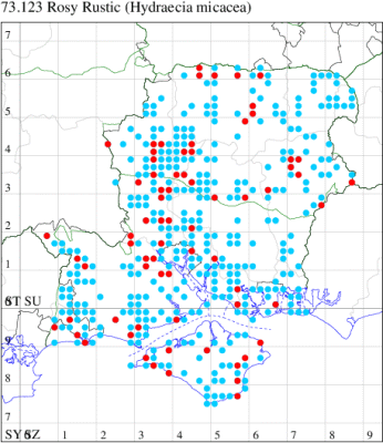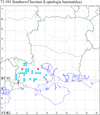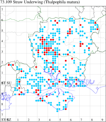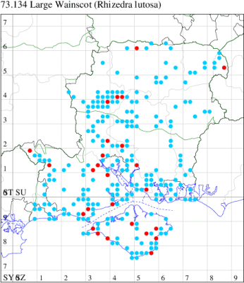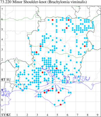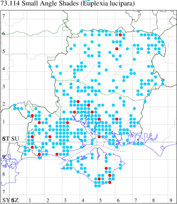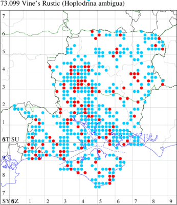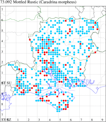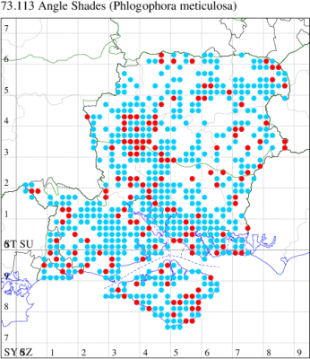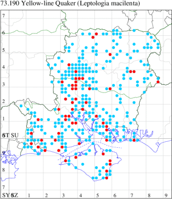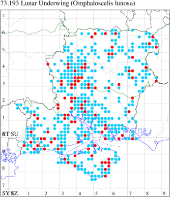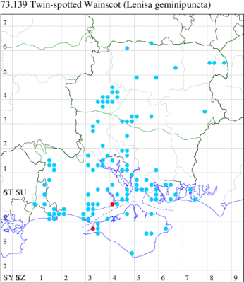 VC11: Marchwood, one, 17 Sep; one, 15 Oct (CTha); Romsey, one, 13 Sep (KPea); Dibden Purlieu, one, 01 Sep (RAC); Swaythling, Southampton, one, 24 Sep (MEdg); Fareham, one, 07 Oct (ADT); four, 07 Oct (IMcP); one, 18 Sep; one, the second in much better condition, 23 Sep; one, 06 Oct; one, 09 Oct; one, 15 Oct (MLO); one, to light, 24 Sep; one, to light, 07 Oct; one, to light, 08 Oct (KJW); Botley, one, 07 Oct; one, 08 Oct; one, 14 Oct (SLB); Portsmouth, one, 03 Jul; one, 04 Jul; one, 07 Jul; one, 07 Oct (IRT); Pennington, one, 24 Sep; one, 25 Sep (RFC); Southsea, three, 24 Sep (JRL det. ); Eastoke, Hayling Island, one, 15 Oct (STho det. JHH);