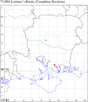 Very rare immigrant (less than 10 previous UK records) from southern Europe, appearing on the south coast, recorded once in Britain at Totteridge, Hertfordshire on 8 October 1967, with no further records until one was recorded in Hampshire, as shown here, in 2021: investigation is ongoing as the exact specific identity of this and the original 'Lorimer's Rustic' as taxonomy is uncertain. Wingspan 28-34 mm. Main confusion species is Pale Mottled Willow Paradrina clavipalpis in which forewing light grey rather than brown, reniform stigma usually edged distally with a buff lunular mark and subterminal fascia with buff spots between veins (MBGBI Vol 10). Larva feeds on various herbaceous plants; no evidence of breeding in the UK.