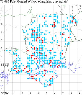 A common migrant from mainland Europe, appearing most frequently in southern coastal counties, less often inland and northwards to southern Scotland and the Inner Hebrides; recorded throughout Hampshire and the Isle of Wight. Wingspan 26-32 mm. The main confusion species are Pale Mottled Willow Paradrina clavipalpis and the rare migrant Dark Mottled Willow S. cilium, but combination of resting position, in which forewings are wrapped tightly around the body, and brownish centres to reniform and orbicular stigmata usually diagnostic. Larva feeds on Dandelion, Groundsel, Broad-leaved Dock, Curled Dock and Common Restharrow.